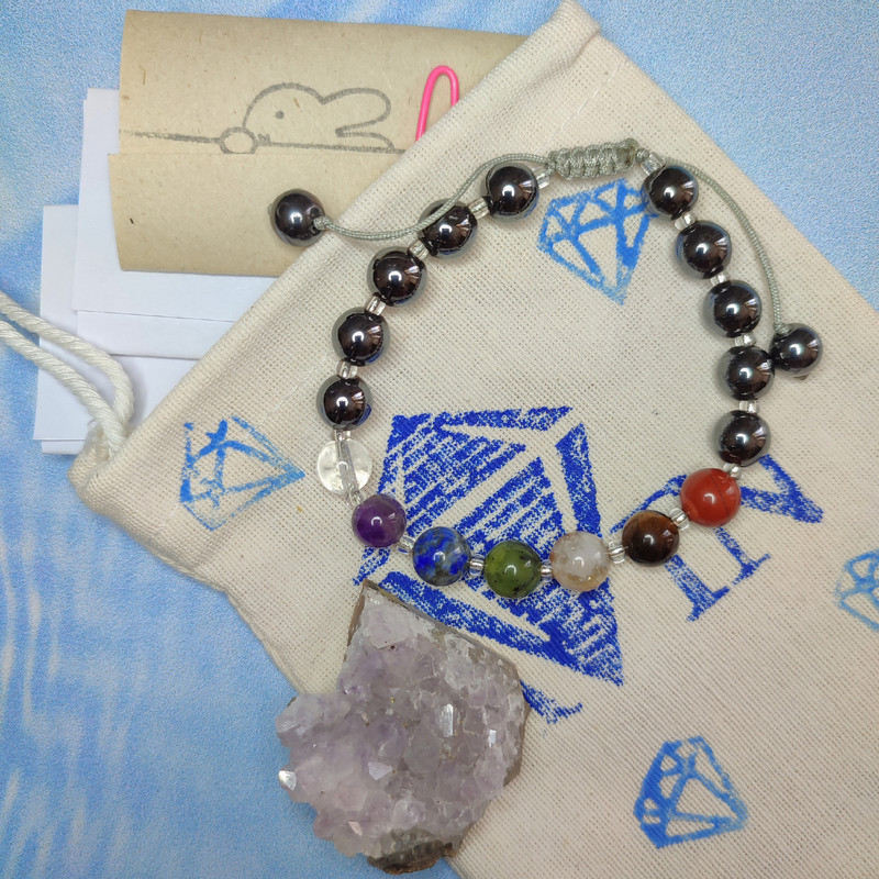متشکل از سنگ های طبیعی کریستال کوارتز،آمیتیست،لاجورد،یشم،سیترین،چشم ببر،جاسپر سرخ و حدید همراه کاتالوگ همراه یک عدد بلور طبیعی آمیتیست بسته بندی در کیسه الیاف طبیعی