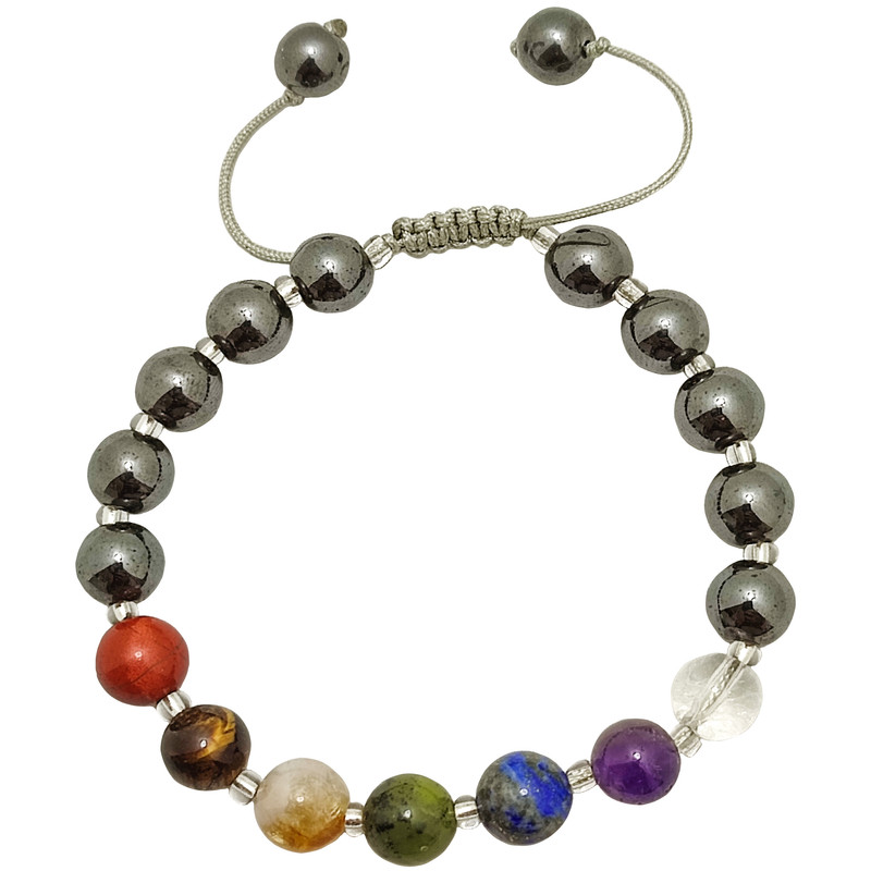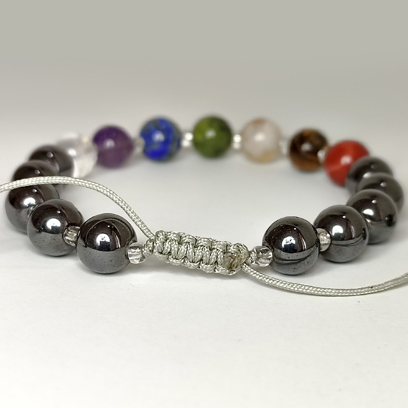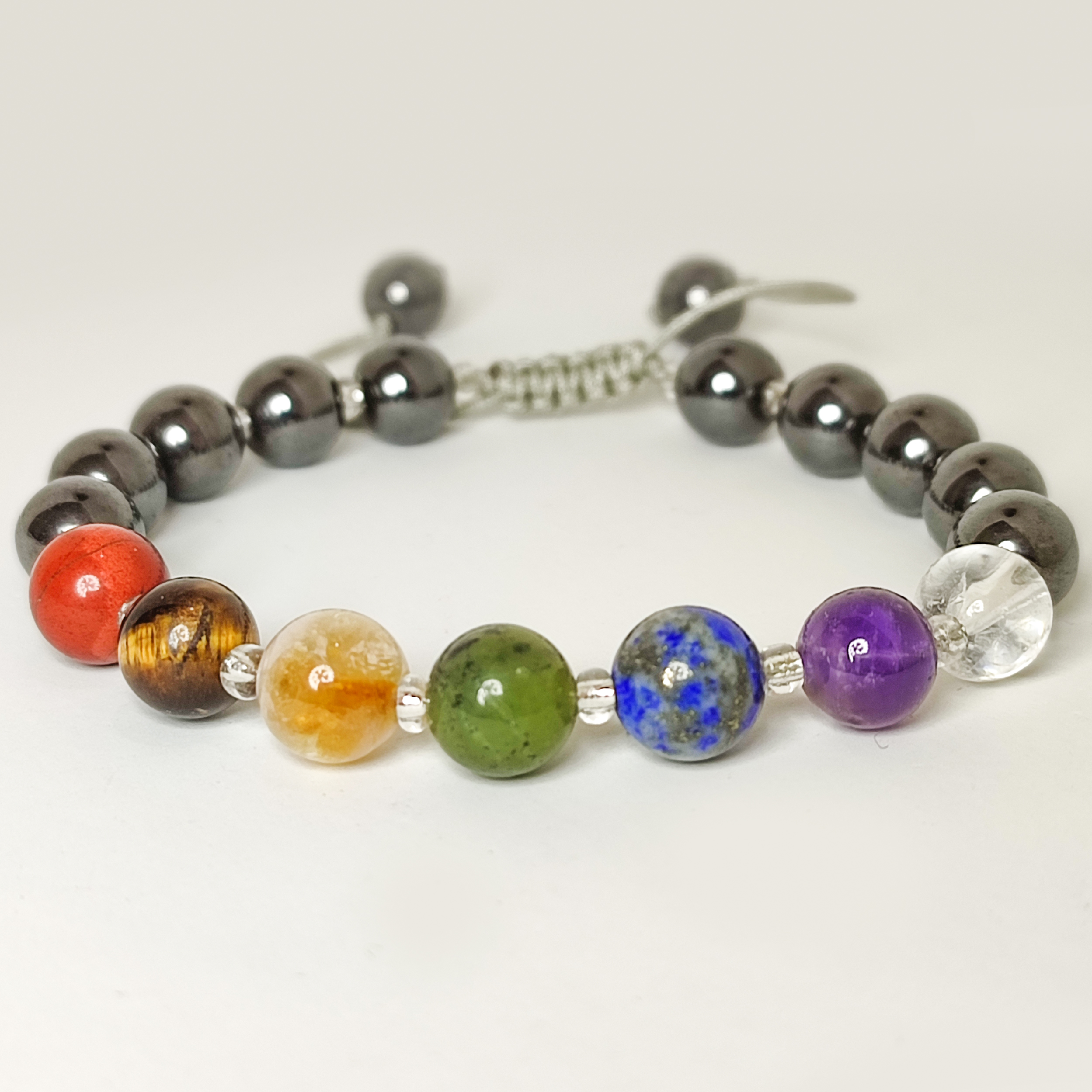 دستبند هفت چاکرا ساخته شده از سنگ های طبیعی و معدنی کریستال کوارتز،آمیتیست،لاجورد،سیترین،چشم ببر،جاسپر سرخ اونتورین و حدید